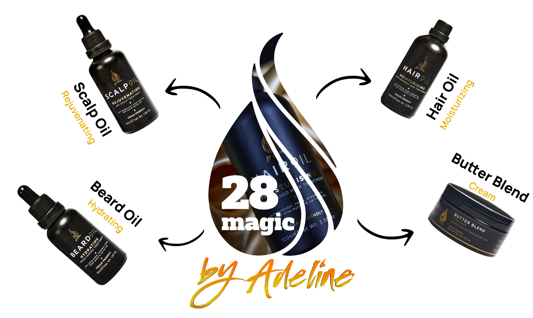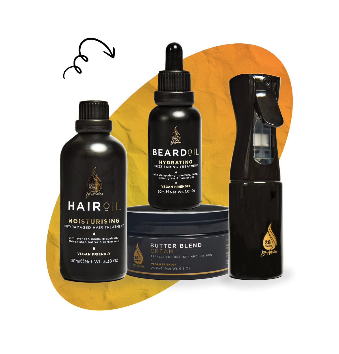 Here at 28MagicOil, we pride ourselves on carefully selecting ingredients that protect, moisturise and revitalise your hair, scalp and skin. Our oils are all organically selected to ensure that your hair gets the best of the best. Our many years of research before the release of the brand, in 2022, has lead to us to the conclusion that various hair types require a various combinations of 28 different essential oils. When these oils are mixed together with our secret ingredient they provide a range of cures and solutions for everything on your head; from the scalp to the latest split-end you may have grown and everything in-between! These oils help promote hair growth, scalp rejuvenation, damaged repair and moisturise all whilst giving it a shiny, glossy look!